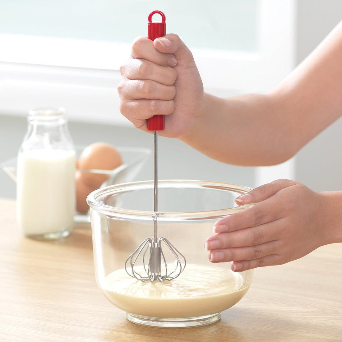 Poliestireno y acero inoxidable. D. 6 x 25 cm. Después de que conozcas el Batidor Plus, no lo podrás dejar y se convertirá en un básico en tu cocina. Te ayuda a batir fácil y rápido la mezcla para hot cakes, la leche para capuchino y las claras. ¡Todo esto sin tanto esfuerzo!