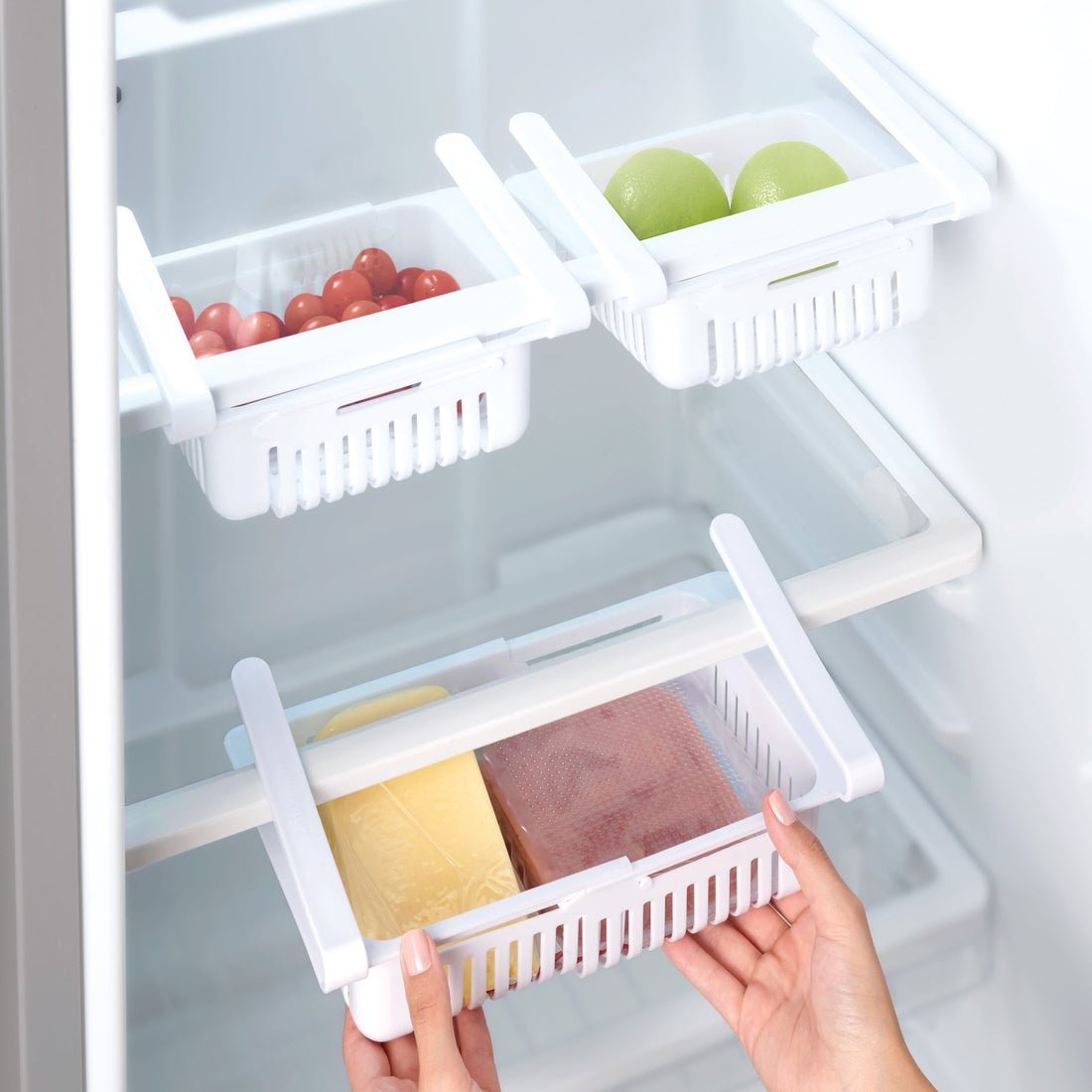 Polipropileno. 1 pieza. Soporta 850 g. 29 x 16 x 8 cm. Cerrado: 21 x 16 x 8 cm. Optimiza el espacio de tu refrigerador con la Canastilla Refri, que se coloca y ajusta sobre los bordes de las charolas del refrigerador.