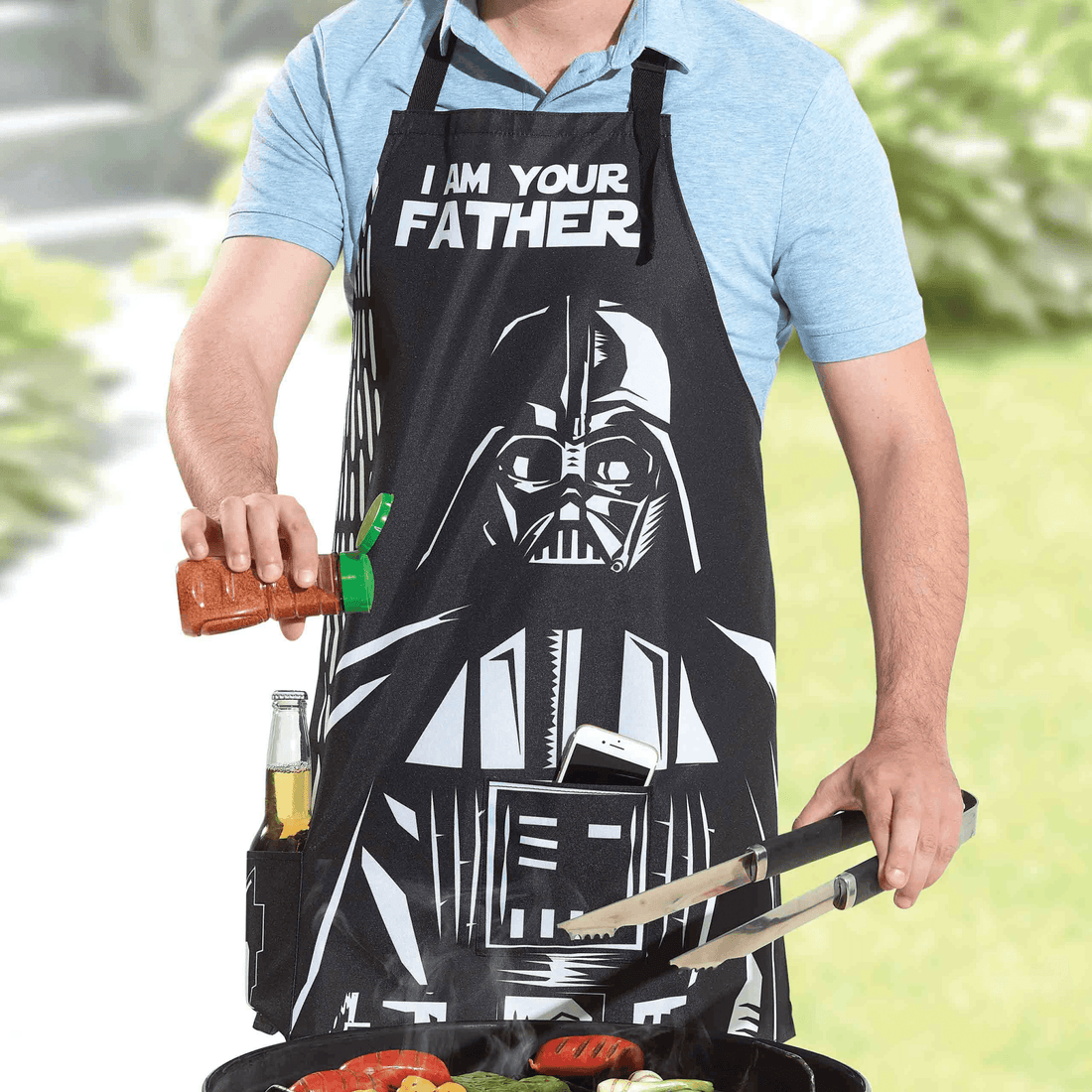 Poliéster. 71 x 70 cm. Tiras de ajuste en el cuello de 63 cm. Tiras de ajuste laterales de 69 cm. ¡Protege al mejor padre de la galaxia! Con el mandil de cocina Dad Vader de Star Wars, el complemento ideal para esas carnes asadas. El delantal es impermeable, resistente al calor, tiene bolsillos para poner la bebida, el celular, utensilios y, además, cuenta con un cuello ajustable. Diseño con texto: “I am your father”.