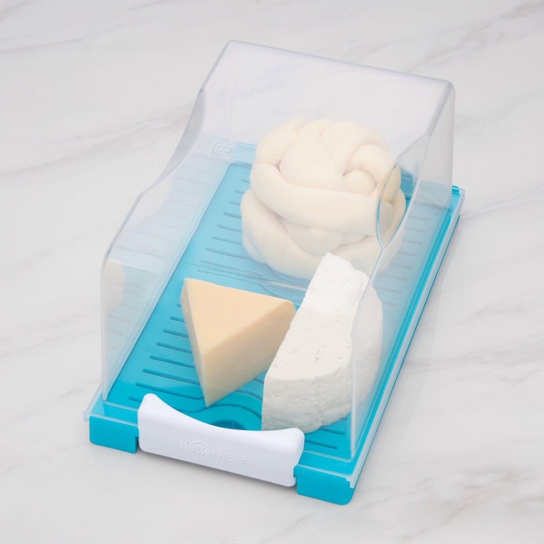 Polipropileno. Capacidad: 2.4 kg. 25 x 15 x 11 cm. Incluye charola escurridora. Mantén tus quesos frescos por más tiempo al guardarlos en la Maxi Quesera, un contenedor con charola para escurrir el suero y con broches para que cierre perfectamente.